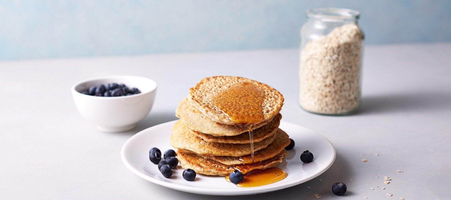 Първо, сложете незалепващ тиган на средно загрят котлон и оставете за няколко минути. Много е важно котлона да е на средно силен огън. Ако от тигана започне да се издига дим или изпарение значи е много силно загрят. След това, в блендер сложете банана, яйцата и ги разбийте до получаване на гладка смес. Добавете протеина на прах и овесените ядки към получената смес и отново разбийте с блендера до получаване на хомогенна смес. Задължително добавяйте сухите съставки след течните, за да не залепне протеиновия прах по стените и дъното на блендера. Изсипете четвърт от сместа в предварително загретия тиган и оформете палачинка с диаметър приблизително 12 см. Ако искате, можете да направите палачинките по-дебели, като изчакате 20 секунди след като сте изсипали четвърт от сместа и добавете още малко от нея върху палачинката. Изчакайте още 30 секунди (или докато палачинката получи лек златен загар от долната страна). След това използвайте шпатула, за да обърнете палачинката и изпечете другата страна за още 30 секунди. Повторете докато свърши сместа. Овкусете с любимите си добавки (ние предпочетохме боровинки и кленов сироп - най-добрата комбинация за палачинки на света).