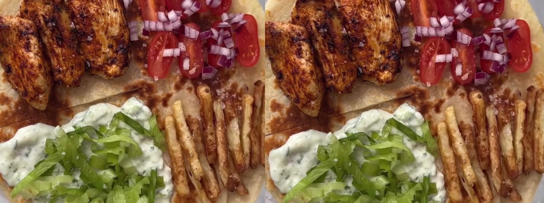 Първо, пригответе соса дзадзики. Настържете краставицата и изцедете течността получена от нея преди да я поставите в малка купа. След това, добавете останалите съставки за соса и ги разбъркайте добре. Оставете настрани. След това, сложете картофките в еър фрайър (или фурна). Сгответе ги според инструкциите на опаковката или докато хванат приятен загар и се изпекат отвътре. Междувременно, затоплете малко зехтин в тигана. Овкусете пилешкото с червения пипер, кимиона, кориандъра и солта. Сгответе го на средно силен огън докато се сготви изцяло отвътре. Оставете го да се охлади преди да го нарежете. Затоплете арабската питка и я сложете в чиния. Срежете я в средата и след това аранжирайте чинията като поставите във всяка четвъртина различна заготовка - пилешко, салата, дзадзики и картофки. Поръсете със сол и пипер, ако желаете. Можете да сложите риган, ако обичате средиземноморски вкусове.