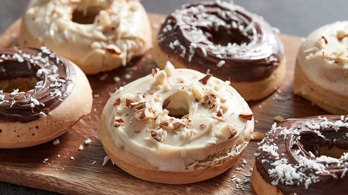 7) След като донатите се изпекат и охладят достатъчно, внимателно вземете всяка от тях и потопете във вашия протеин на прах по избор, за да покриете горната част.