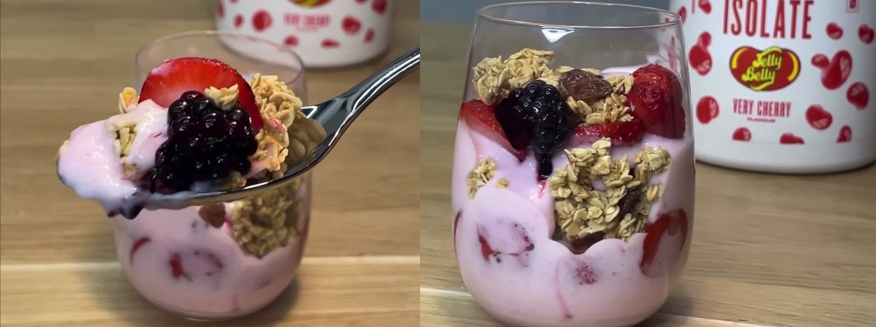 1 мерителна лъжица Clear Whey Isolate - Jelly Belly (Very Cherry) 180 г кисело мляко 45 г високопротеинова гранола Шепа пресни боровинки Шепа пресни ягоди (нарязани)