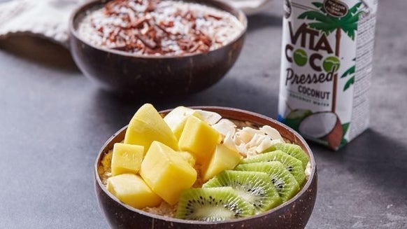 Първо, смесете в купичка зехтина, пастата хариса, солта, пипера и лимоновия сок и разбъркайте. Намажете пилешкото месо с получената смес. Когато цялото месо е добре покрито с маринатата, оставете го настрани. Междувременно, нарежете лука и чесъна. След това сложете незалепващ тиган на котлона и разтопете една супена лъжица кокосово масло в него. Добавете лука и гответе за 5 минути, докато омекне. Сложете и чесъна в тигана. Гответе още 2 минути преди да добавите куркумата и червения пипер. Смесете всички подправки заедно с лука и чесъна. След това добавете и сухия кускус. Сложете кубчетозеленчуков бульон във съда с вряла вода, разбъркайте и изсипете течността в тигана. Разбъркайте всичко до получаването на хомогенна смес и оставете да се готви, докато кускуса абсорбира течността. Междувременно, сложете тиган от лято желязо или грил тиган на друг котлон на средно силен огън и разтопете една супена лъжица кокосово масло в него. Сложете маринованото пилешко и гответе 4-5 минути от всяка страна преди да махнете от котлона и оставете настрани. След като кускусът е абсорбирал течността и е удвоил размера си, изсипете го в голяма купа и добавете стафидите, кедровите ядки, магданоза, сока от половин лимон, солта, сладкия и лютия пипер. Във всяка предварително приготвена кутия за храна сложете първо кускус на дъното, след това добавете пилешко месо и зеленчуци по ваш избор. Ниал е сложил хрупкави черени чушки, чери домати и рукола.