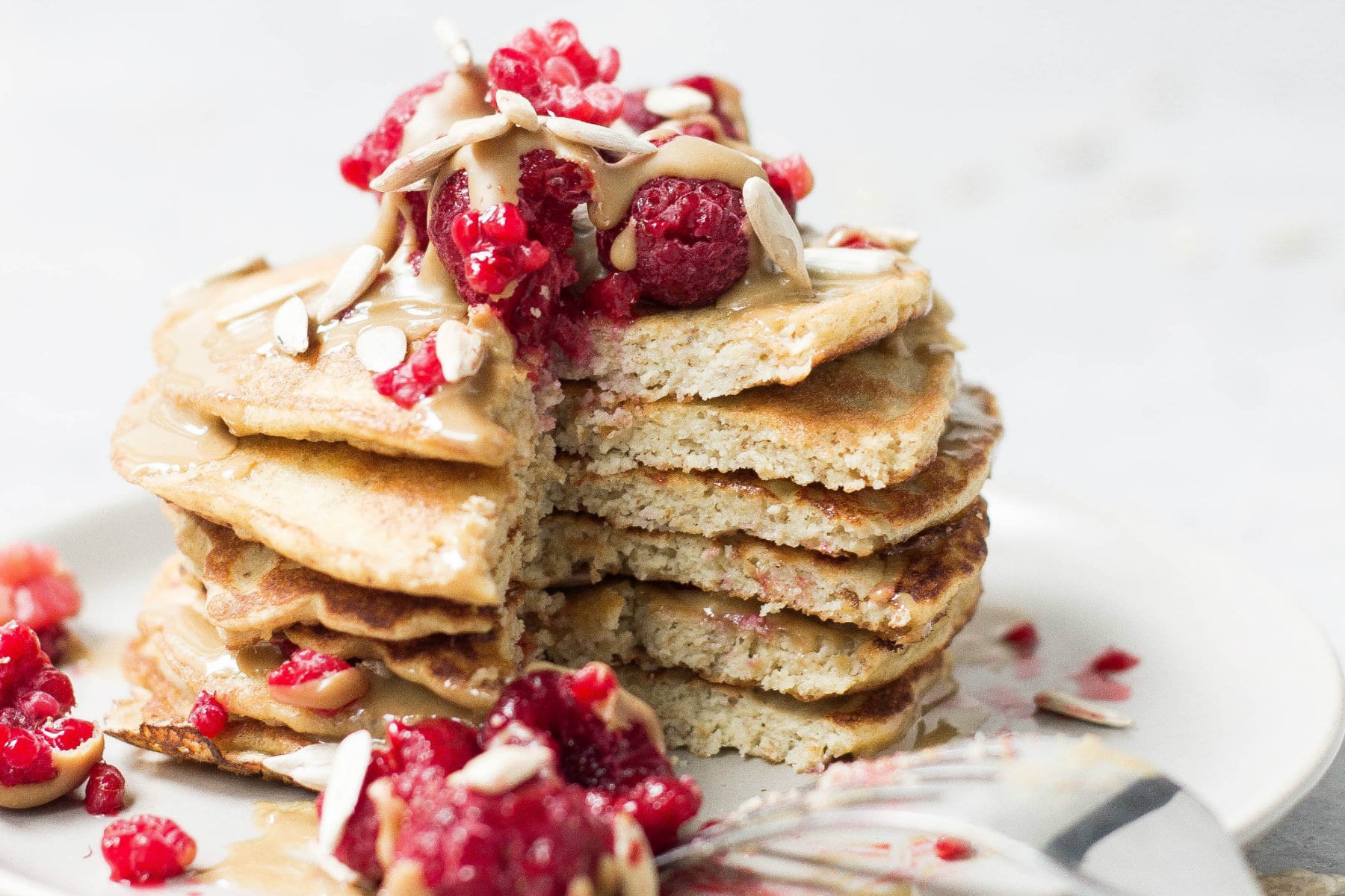 Продължете докато свърши сместа за палачинки. Украсете палачинките с бадемово масло и малини. Насладете им се!