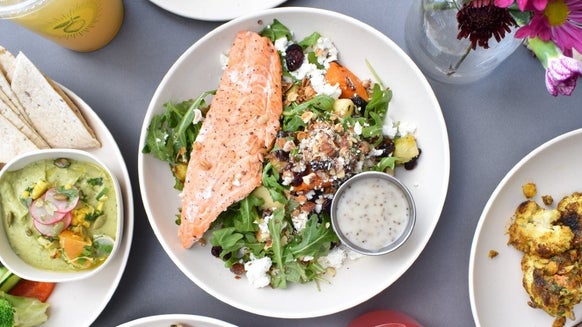 1 с.л. Кокосово масло 450 г сготвен бял ориз 600 г пилешки гърди 6 шепи спанак 75 г царевица 3 с.л. сос Барбекю 1 ч.л. сладък червен пипер 9 чери домати