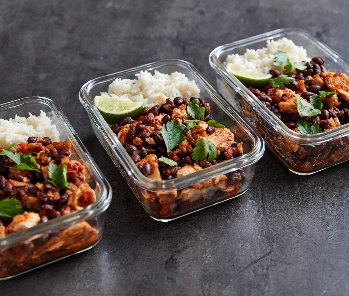 - След това добавете прецедения черен боб и доматения сос. Разбъркайте добре, докато всички съставки се смесят в тигана. Оставете всичко да се готви за няколко минути и след това разделете по равни количества в кутии за хранене. Добавете порцията ориз към всяка. Поръсете със свеж кориандър и сложете резен лайм.