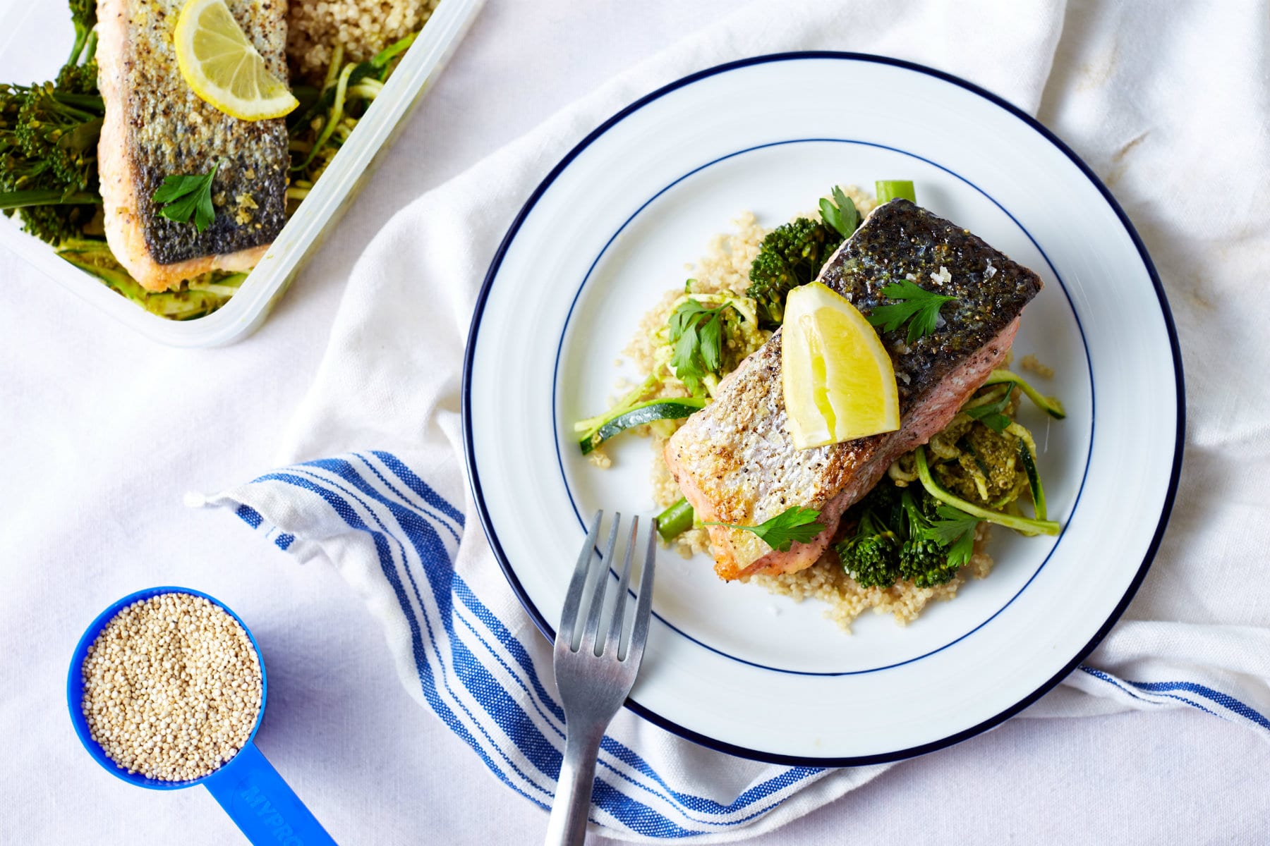3) Сгответе кускуса според упътванията на опаковката и след това разделете количеството в 3 контейнера за храна. Разпределете сьомгата, зеленчуците и малко от лимона в трите контейнера и ги оставете да се охладят. Затворете контейнерите и ги оставете в хладилника. Можете да ги съхранявате там до 3 дни. Преди консумация ги затоплете в микровълновата на пълна мощност за 3 минути или докато станат горещи.