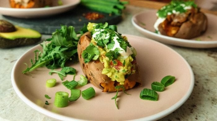 Начин на приготвяне: 1. Загрейте фурната си до 200 ° C / 400 ° F. 2. Набодете сладкия картоф с вилица навсякъде и след това печете във фурната за 45-50 минути. 3. Междувременно създайте един от трите пълнежа: За гуакамоле: поставете авокадо, лук, чесън, лют червен пипер, домати и кориандър в купа и използвайте вилица, за да го омесите заедно в гладък гуак. За тона майо: добавете риба тон, майонеза, лимонов сок, люспи лют червен пипер, лук, чесън и краставица в купа и разбъркайте заедно добре. За пилето фахита: загрейте кокосовото масло в тиган, добавете лентите за пилешки гърди и гответе за 5-10 минути. След това добавете подправката лук, черен пипер и фахита и гответе още няколко минути, като се уверите, че пилешкото месо е напълно сварено, без да е розово в средата. 4. След като сладкия картоф е изпечен, извадете от фурната, оставете да изстине и след това нарежете от края и през центъра по средата, за да се отвори. 5. Сега, напълнете го по ваш избор! Добавете допълнителни добавки - Найл е заложил на щедро количество настърган кашкавал с риба тон и допълнителна гарнитура от заквасена сметана на другите две.