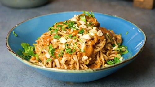 Следващата рецепта е за нудли с фъстъчено масло. Тя е много подходяща за начинаещи вегани, защото се приготвя само за 15 минути и е с високо съдържание на веган протеин - цели 17 грама в една порция. Тази рецепта не изисква използването на заместители на месото, всичко е изцяло на растителна основа. Можете да добавите каквото ви е останало в хладилника. Рецептата е перфектна за вечерите, когато искате да хапнете нещо бързо, но не разполагате с много разнообразни съставки.